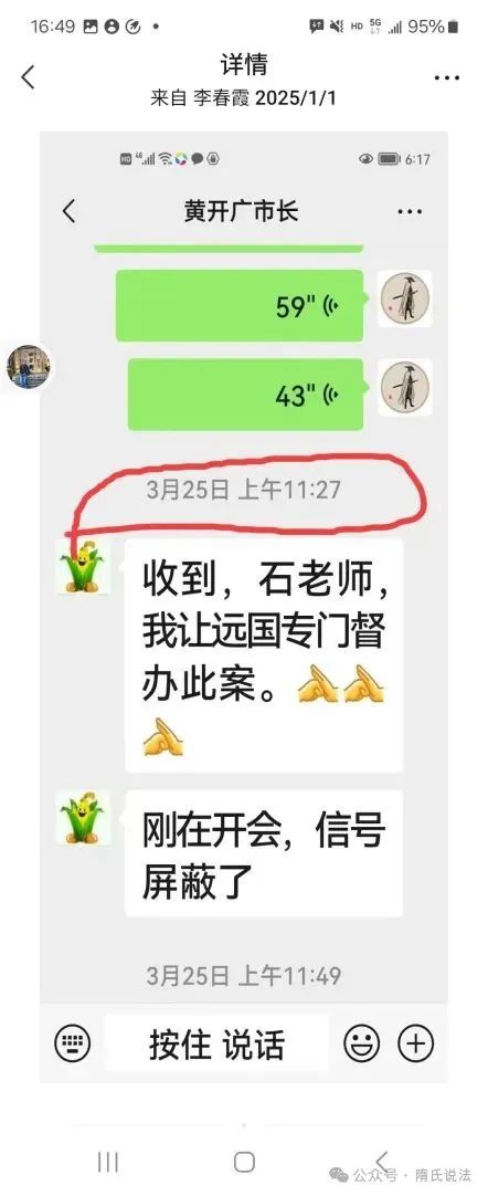 图片为2024年3月25日石野与大冶市副市长兼公安局长黄开广的对话,由被石野骗色而为他育有一年已16岁的儿子的郑州访民李女士2025年1月1日发给刘迎新的关系人,石野把他跟黄开广的对话发给李以吹嘘他在大冶是多么的神通广大。