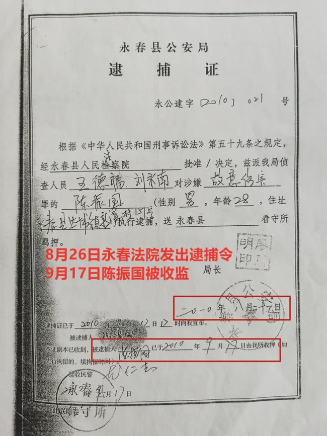 但是,永春法院于2010年8月30日给陈振国送达起诉书副本、开庭传票、附民诉状时,《送达回证》上显示的送达地址,竟然是在“永春县看守所”。